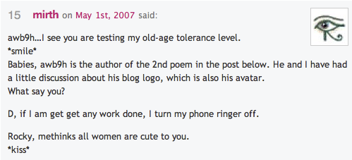 Don’t believe for a second Alec that Mirth is right and you are wrong. She bossed me around behind the scenes about my blog. She was constantly emailing me to take her comments off, fix her comments, etc. Now she has her own blog (which wouldn’t have taken off if she hadn’t stolen my readers!) and IS STILL BOSSING PEOPLE AROUND ALL OVER THE INTERNET. Not surprised!