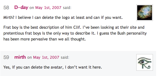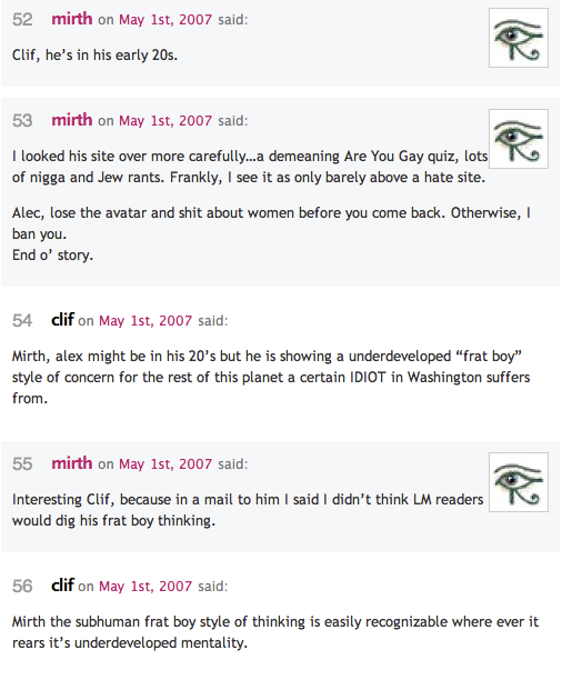 Then I decided to comment on one of her blog posts dealing with a woman who thought she got sick from electrical appliances — nothing too controversial, just a typical comment spewing from me — “Mirth: Nice find. I need that headgear so I can finally get a full nights sleep without having to worry Dick Cheney will swoop through my window and suck my blood”, which included my avatar (the same image as the logo) and a link to my WordPress blog. And that’s when the floodgates opened (for a PDF with the whole transcripts of the thread, click here:
