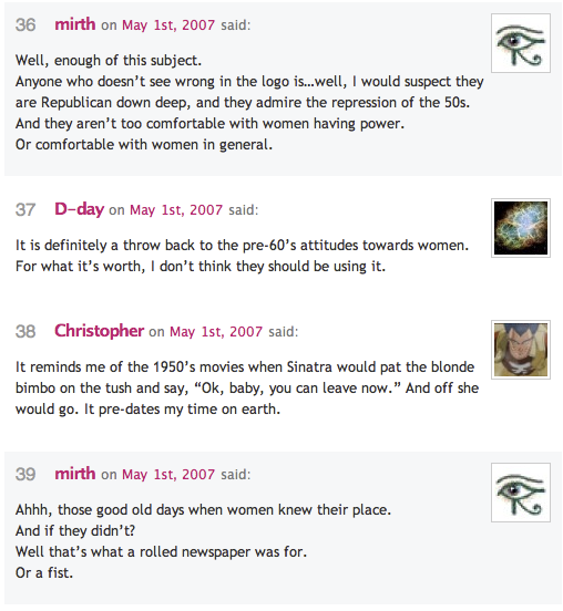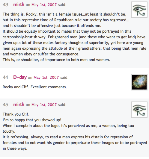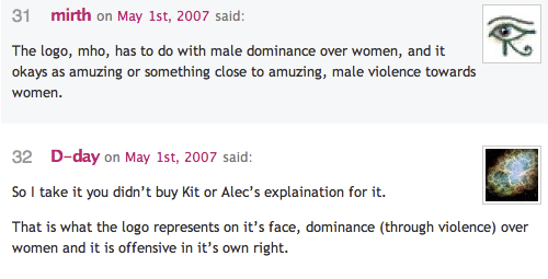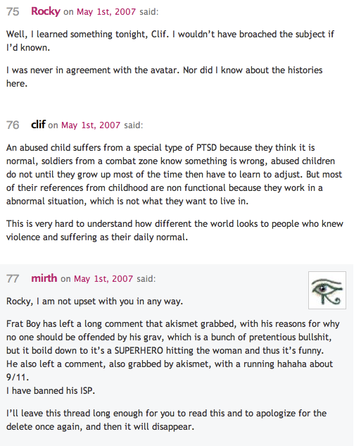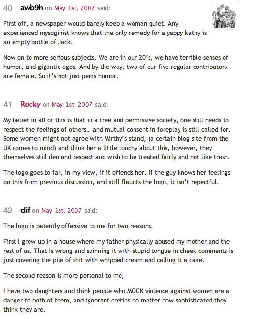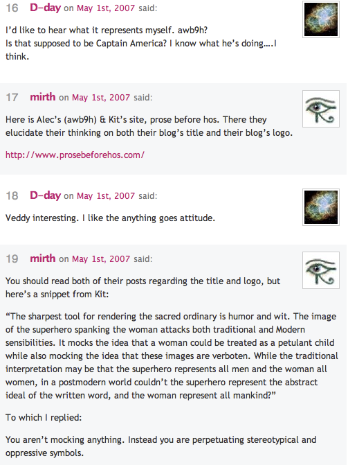 So in one thread, we went to a reasoned discussion on the merits of having a SUPERHERO hit a woman in 50’s get up as a logo to discussions about how we were frat boys making light of child abuse and posting jokes about 9/11. In fact, the only post that came after mine was from Kit, who wrote an excellent rebuttal to the arguments presented by the LM crew: