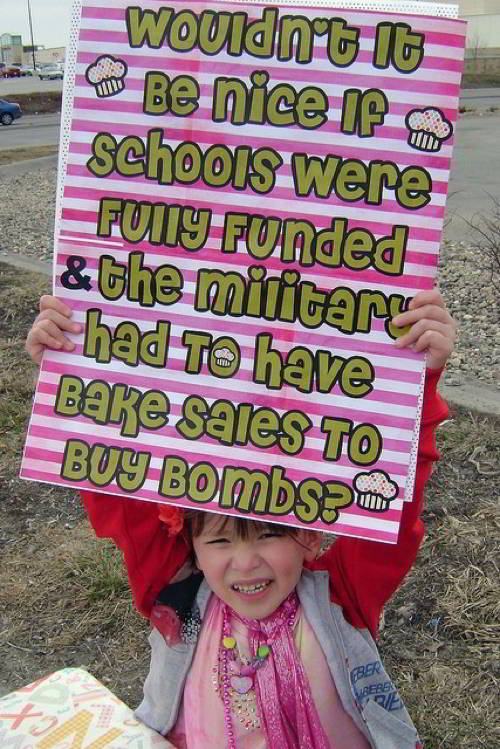 Doubt that this little girl understands the poster she’s holding, but it does provide for hours of pondering what kind of cookies the military would make to acquire weapons.