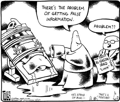 [tags]comic, saddam hussein, iraq, al-qaeda, al qeada, september 11th, finding information on iraq and al-qaeda ties via torture, using torture to get information, false information, pretext of war, comic, iraq and al qaeda links, ties together, 9/11, guantanamo bay, detention center, united states, comic, political cartoon[/tags]