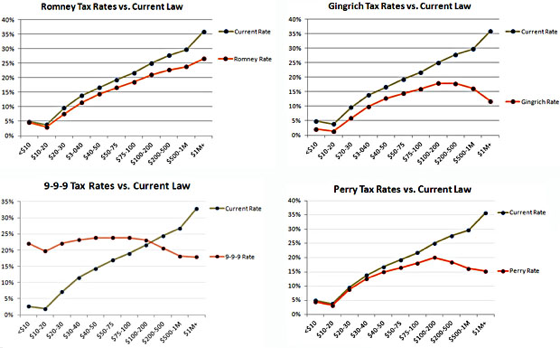 As GOP presidential candidates clamor incessantly about their tax plans to save America, Mother Jones’ Kevin Drum breaks down their plans in this handy and revealing series of graphs. Consider yourself enlightened.