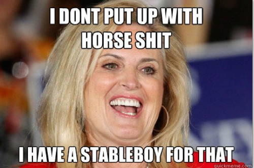 Ann was Mitt’s high-school-hand-job, which in the Mormon world gets you fast tracked to wife status. She deserves no sympathy for being sick, considering how Mitt and Ann disrespect regular working class people who are also sick. She likes to pretend that she has worked hard, but the memes don’t lie: Raising kids on a millionaire’s budget is not an achievement. Her biggest contribution to society is a dancing horse.