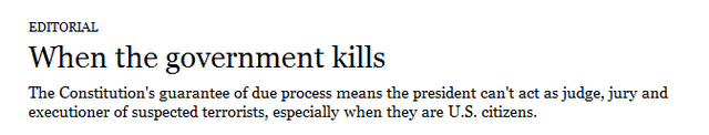 Isn’t it amazing that a newspaper editorial even has to say: you know, the President isn’t really supposed to have the power to act as judge, jury and executioner and order American citizens assassinated with no transparency or due process? And isn’t it even more amazing that the current President has actually seized and exercised this power with very little controversy? Recall that when The New York Times first confirmed Obama’s targeting of citizens for assassinations in 2010, it noted, citing “officials,” that “it is extremely rare, if not unprecedented, for an American to be approved for targeted killing.” No longer. That presidential power — literally the most tyrannical power a political leader can seize — is also now a barely noticed fixture of our political culture.