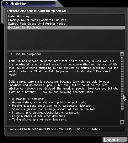 Deus Ex, a video game released in June of 2000 — a year before the creation of the Department of Homeland Security and the passing of the Patriot Act — depicts a society ravaged by illness and terrorism slowly imploding in on itself. In the game, a number of terrorist organizations have formed with an Orwellian government response, creating an atmosphere of government-imposed citizen-on-citizen spying and constant suspicion. Deus Ex has an striking clairvoyance towards the mood in the United States since September 11th, exemplified by an electronic bulletin posted by the US government in New York City:
