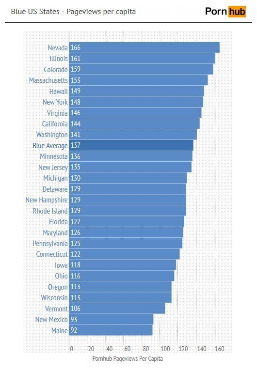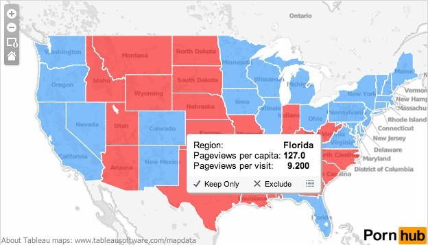 What’s most compelling, though? According to Buzzfeed, if Pornhub were to just use porn consumption per capita as a predictor of political orientation, they could have predicted the results of the 2012 elections with 70% accuracy.