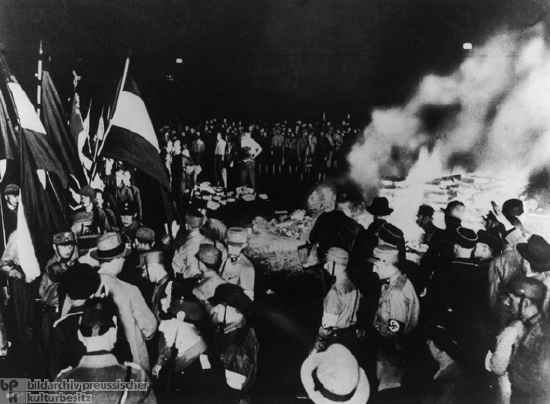On May 10th, 1933, university students and German citizens burned 25,000 volumes of books deemed ‘un-German’, as nationalist students marched in torchlight parades “against the un-German spirit.” The scripted rituals called for high Nazi officials, professors, rectors, and student leaders to address the participants and spectators. At the meeting places, students threw the pillaged and unwanted books into the bonfires with great joyous ceremony, band-playing, songs, “fire oaths,” and incantations.