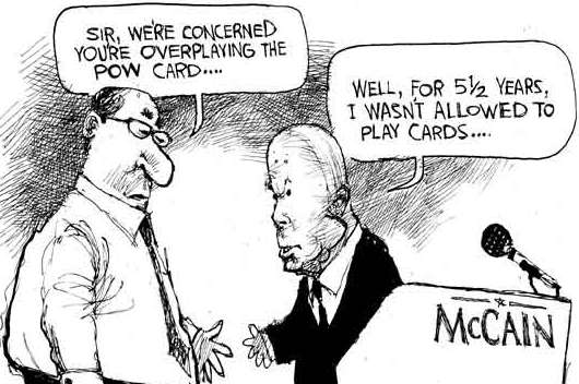 [tags]john mccain, POW, vietnam war, 5 years, solitude, torture, prisoner of war, viet cong, hanoi hilton, republicans, propaganda, exploitation, cartoon, political cartoon[/tags]