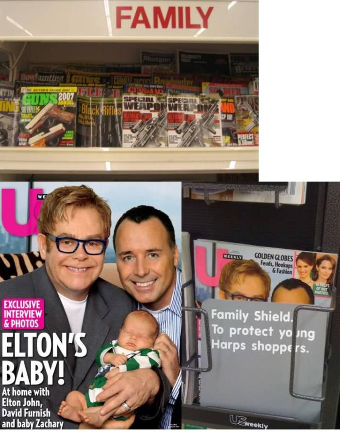 God forbid it be up to the parents to choose whether or not to introduce their children to a lifestyle the parents might not want to teach them yet. Ditto for the firearms magazines, which appear to be high up (around ~5-6ft), and darn near invisible for a child to see.