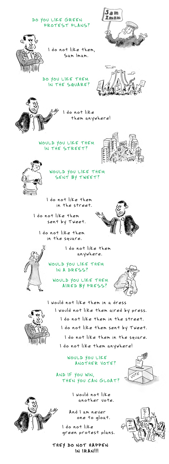 [tags]iran, protests in iran, green eggs and ham, democracy in iran, elections in iran, voting rights, democratic rights, twitter, facebook, social networking, imams, supreme leader, tehran, protests, comic, political cartoon, Mahmoud Ahmadinejad[/tags]