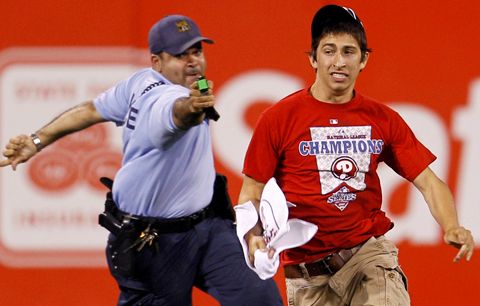 The dad shook his head. But sometime in the eighth inning the son made his move anyway. He jumped the fence, bolted onto the outfield grass, and eluded two security officers before he was finally zapped with 50,000 volts in left-center field.