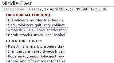 Yet on the same day, 20 Iraqi policemen & recruits were reported executed and a bomb in Baghdad killed 13 (that’s 33 total deaths — the same as the VT shooting — if you’re keeping track). Yet you have to get to the ‘World’ and ‘Middle East’ page of CNN and BBC News respectively if you care to update your Iraq body counts (the CNN’s World page even has it’s front page article as a feature piece on the ‘World Reacts’ to the Virginia Tech Shootings):