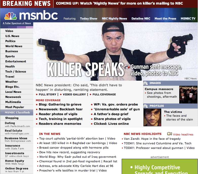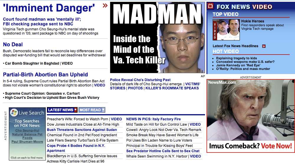 On FoxNews, you get ‘Imminent Danger’ and a picture of the ‘Mad Man’ himself on the front page — so more reporting on the psyche of our deranged Blacksburg shooter: