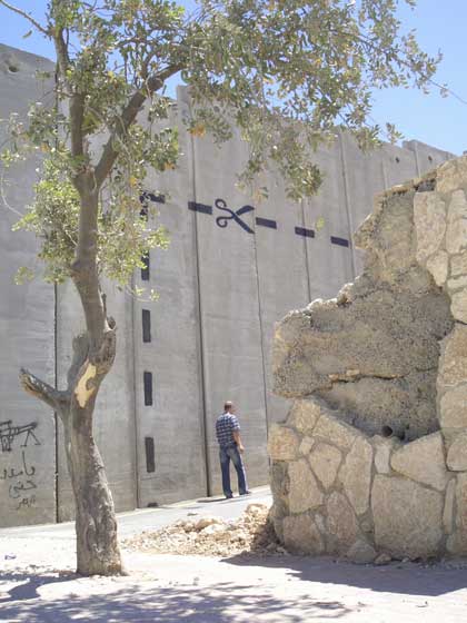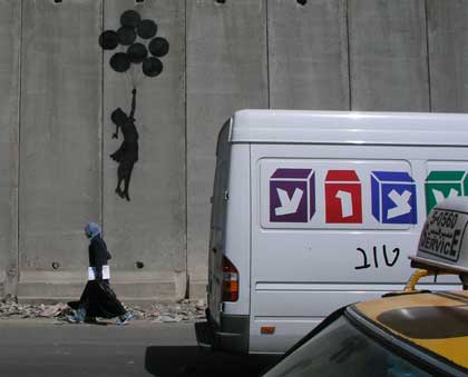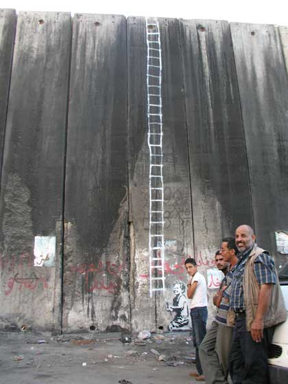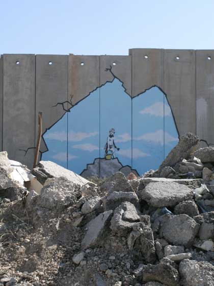 Call it a barrier, call it apartheid, call it what you will, but these are some amazing drawings by art anarchist Banksy on the Israeli separation/segregation wall in Palestine (click on the thumbnails for bigger pictures):